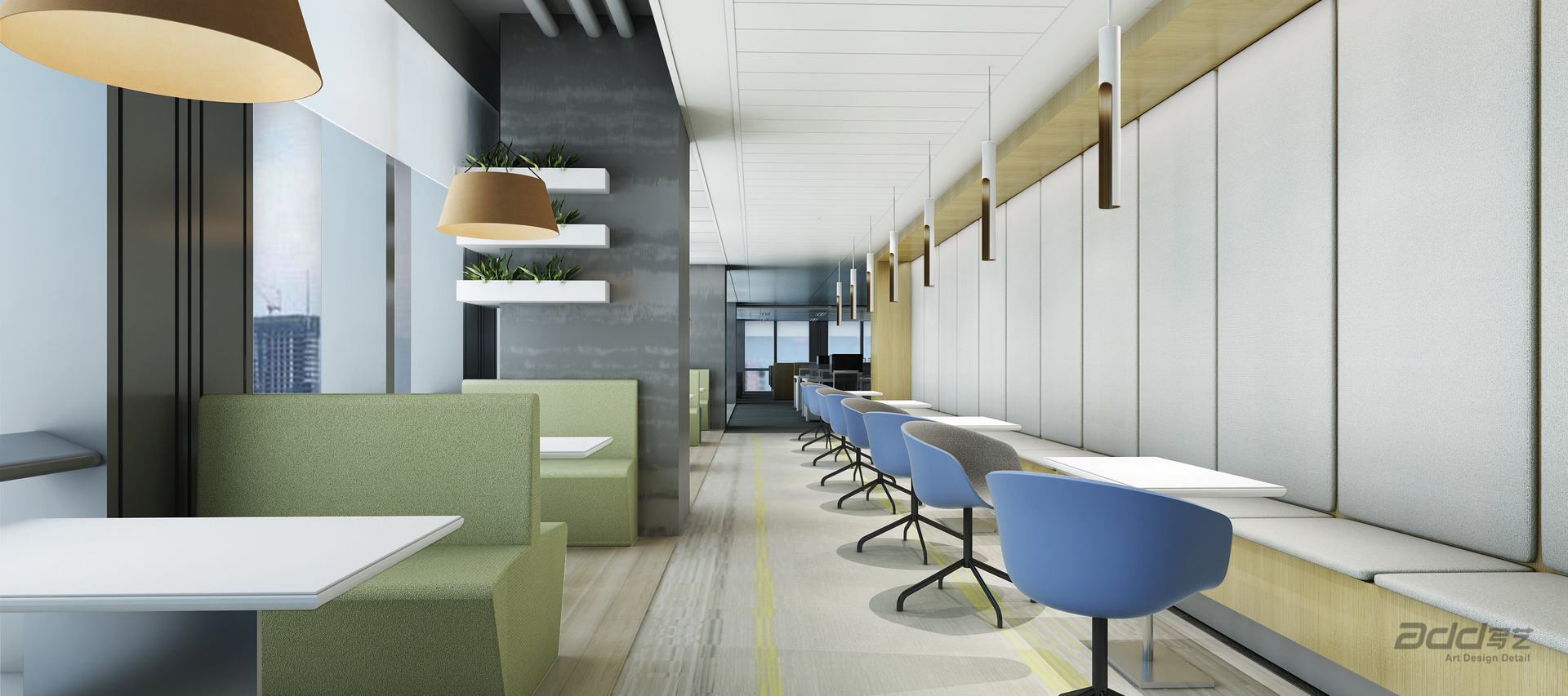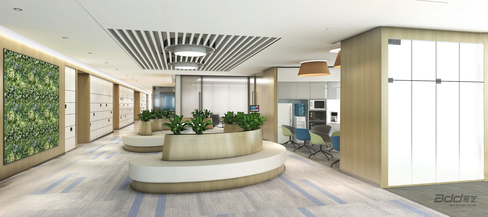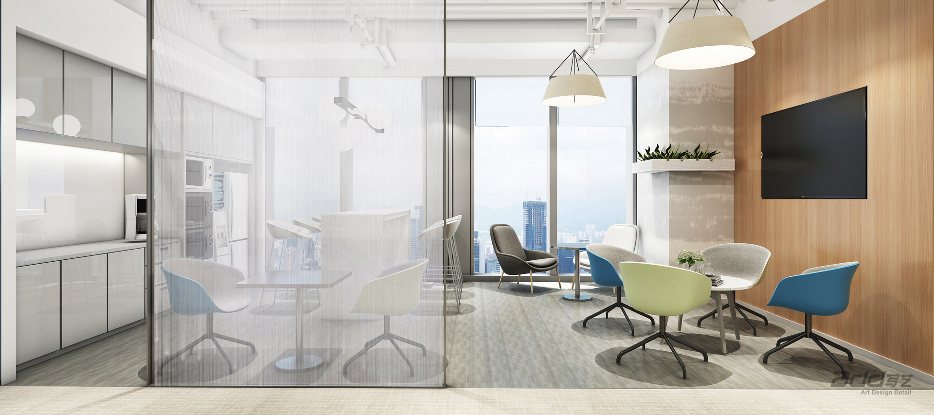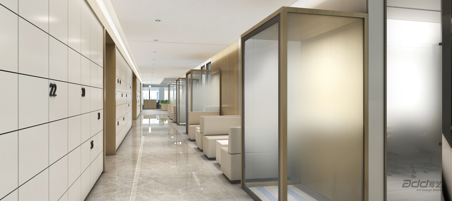 ADD寫藝在接待大廳,會議中心,以及茶水間和共享辦公處,安排了數字化的管理和設計。同時打破原來傳統的深色木飾面、奢華花色大理石設計風格,用了淺木色、白色大理石、科技感的陽極氧化鋁板和轉印鋁格柵,整體格調充滿高級感。一些工位設置共享工位,大大提高了工位的使用率。共享工位,可以設置很多的式樣:卡座、沙發、創意工位等,這樣共享工位不僅是工位,還可以是休閑討論區。會議區的模塊化設計,可移動式隔斷,充分滿足員工工作需求,進行合理分割。