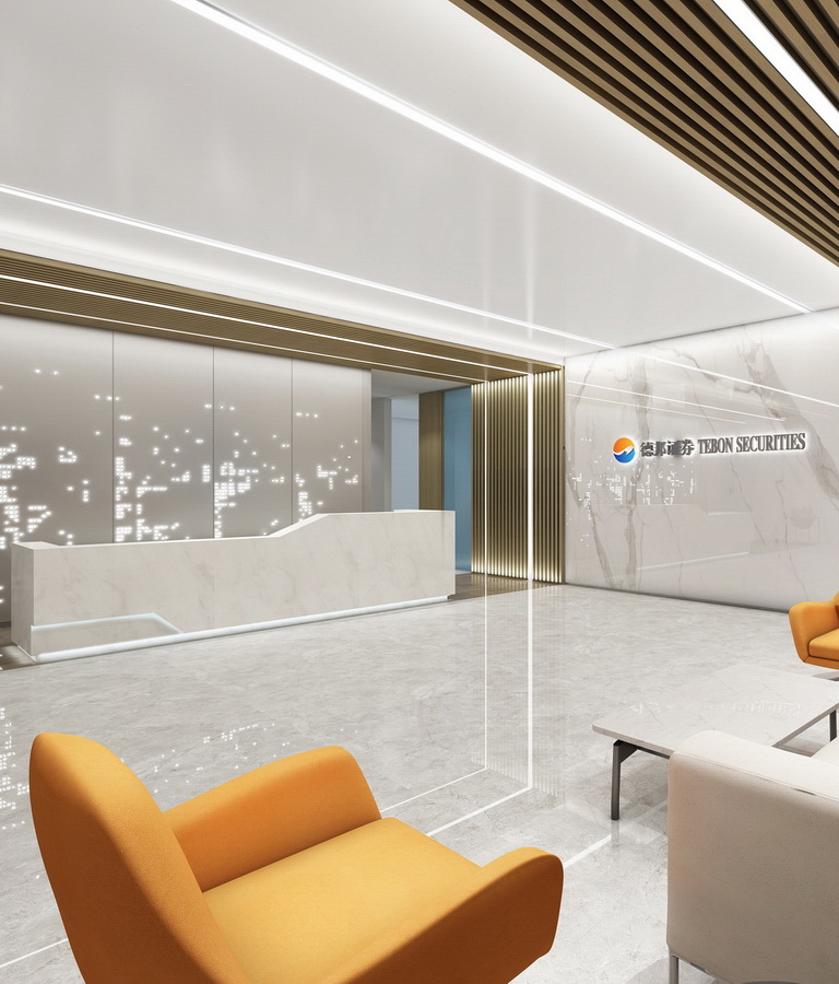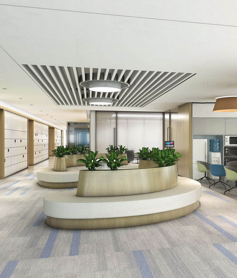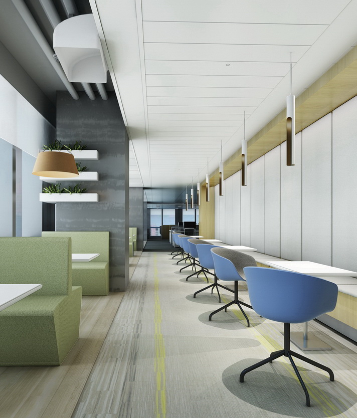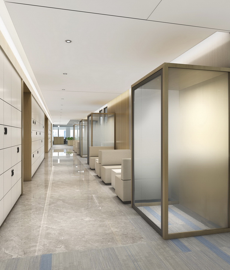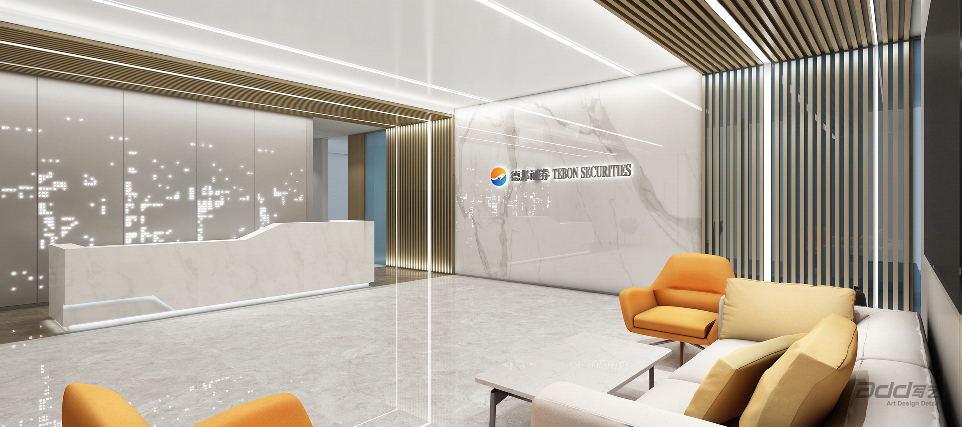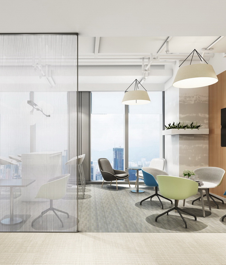 ADD寫藝在接待大廳,會議中心,以及茶水間和共享辦公處,安排了數字化的管理和設計。同時打破原來傳統的深色木飾面、奢華花色大理石設計風格,用了淺木色、白色大理石、科技感的陽極氧化鋁板和轉印鋁格柵,整體格調充滿高級感。一些工位設置共享工位,大大提高了工位的使用率。共享工位,可以設置很多的式樣:卡座、沙發、創意工位等,這樣共享工位不僅是工位,還可以是休閑討論區。會議區的模塊化設計,可移動式隔斷,充分滿足員工工作需求,進行合理分割。