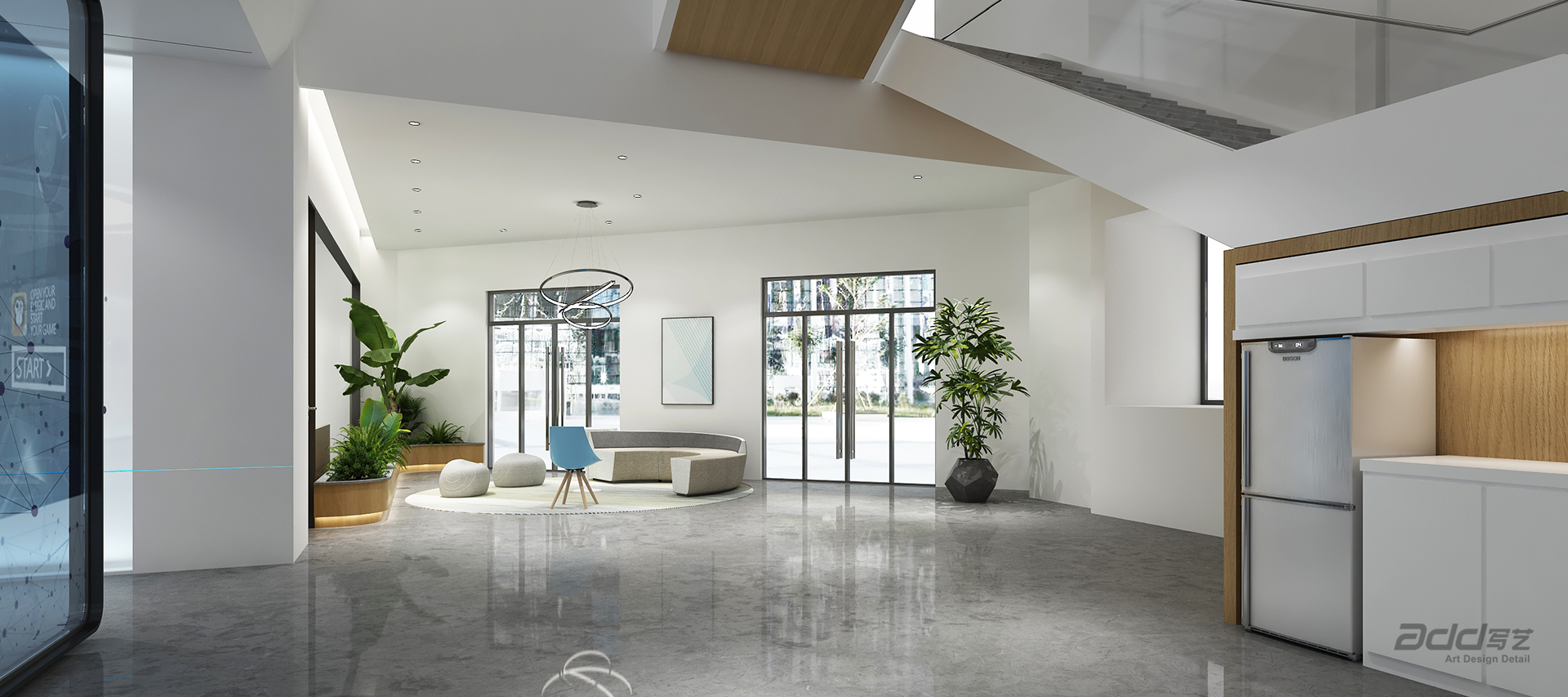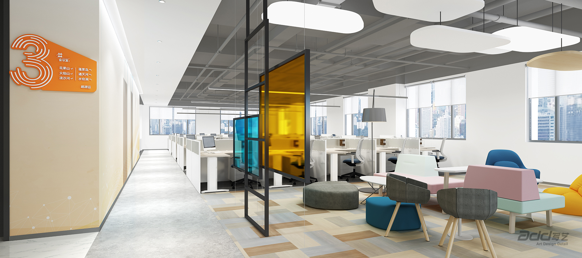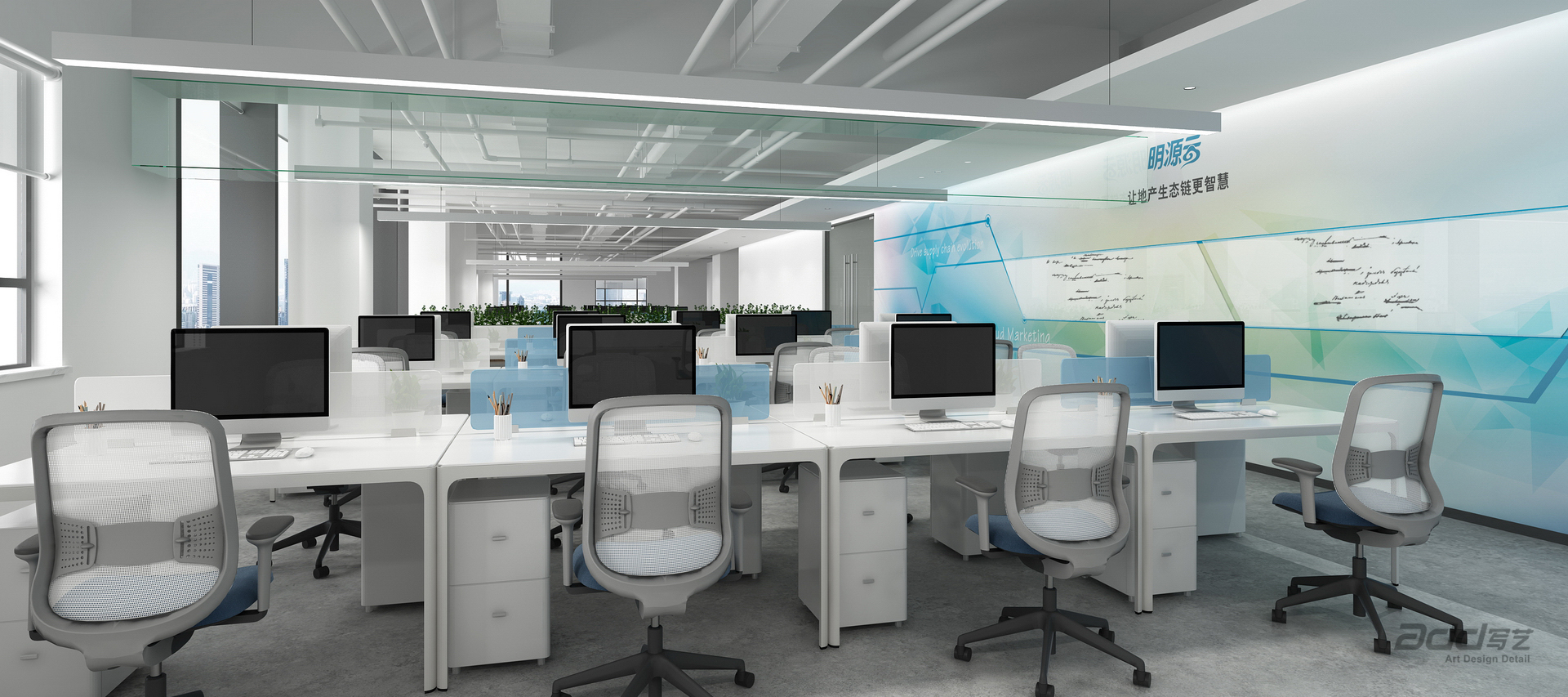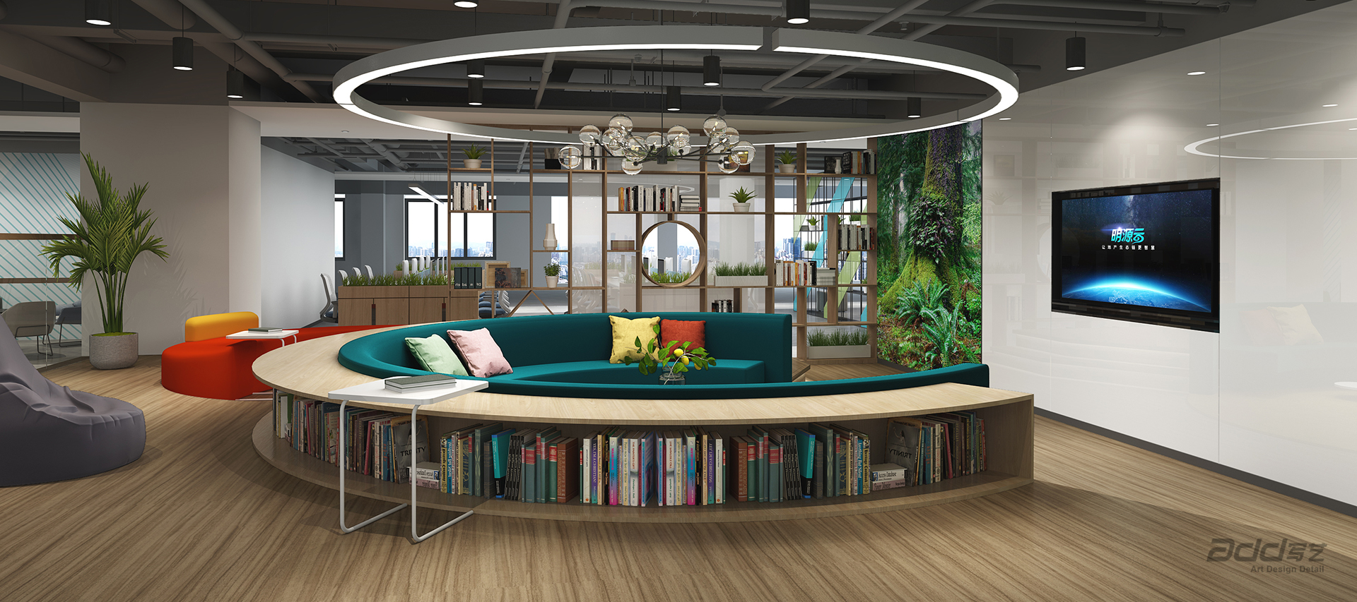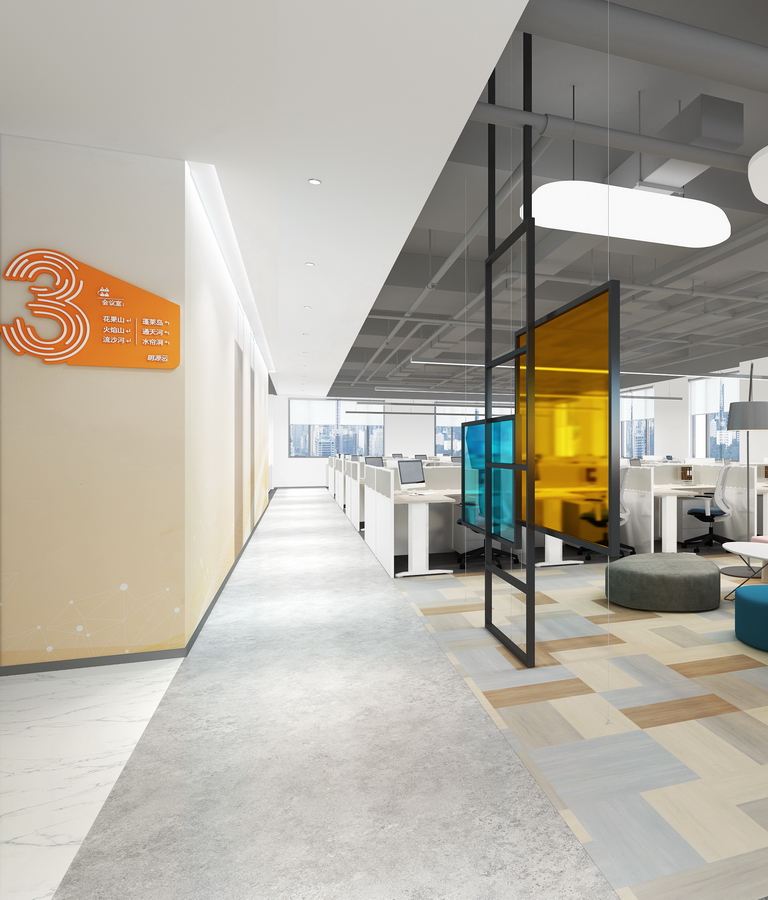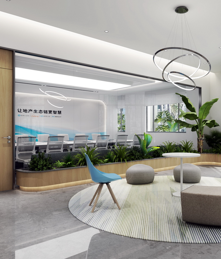大量與企業(yè)形象吻合的視覺裝飾,它具有強(qiáng)烈的整體性與系統(tǒng)性,詮釋一家科技生態(tài)企業(yè)的個性與唯一,形成極致的空間效果。將品牌元素有機(jī)融入每一個場景中,它與環(huán)境氛圍渾然一體,提供創(chuàng)造性的能量,為會議、交流和協(xié)作提供多元的環(huán)境。充足的聚集空間吸引員工定期進(jìn)行隨意的互動和頭腦風(fēng)暴,圖書閱讀區(qū)、路演廳、多種多樣的休閑區(qū)域,都是獨(dú)一無二的體驗(yàn)。支持創(chuàng)新和生產(chǎn)力,辦公室整合了促進(jìn)個人靈感和創(chuàng)造性團(tuán)隊的全新場景。新辦公室是一個努力工作和美好生活的場地,在這里,通過布局有意識的將環(huán)境與員工的社區(qū)活動聯(lián)通起來。