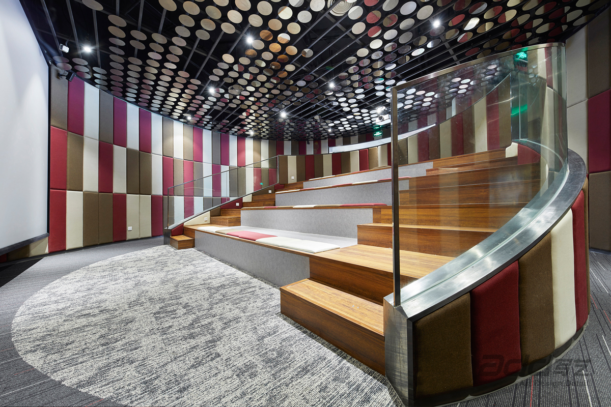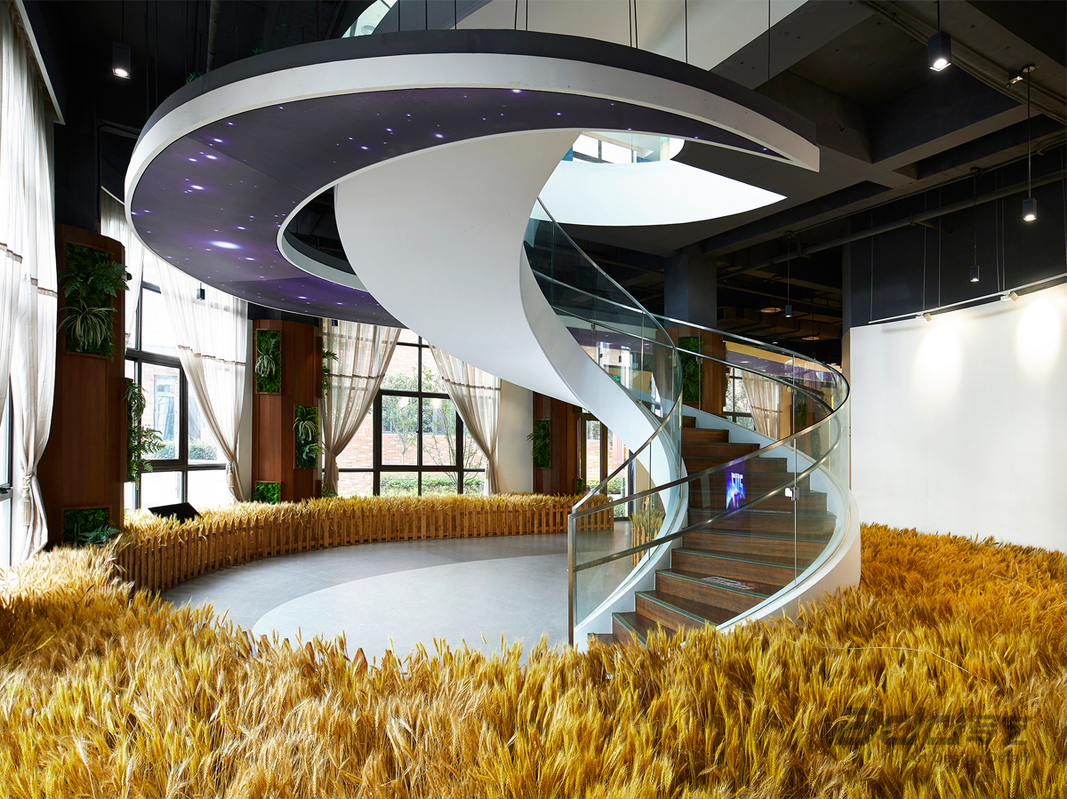 源于活力、鼓舞與協作的品牌精神,以夢幻展廳展現企業的宏圖并引起強烈的共鳴,探尋本真歸于初心。通過在視覺上延伸拓展,提供一個強大的焦點,在不同的相互連接的區域之間創造自由流動,增強企業文化與歸屬感。定制的星空燈呈流線型貫穿,從訪客和員工到達空間的那一刻起,就將他們與品牌聯系在一起。由于動線上的刻意安排,參觀到最后,每個人都會被眼前一片金燦燦的麥穗所吸引。影院頂面懸掛著許多定制的亮片,在空調和新風系統的作用下會自然地來回擺動,好似倒映在湖面上的月光。
